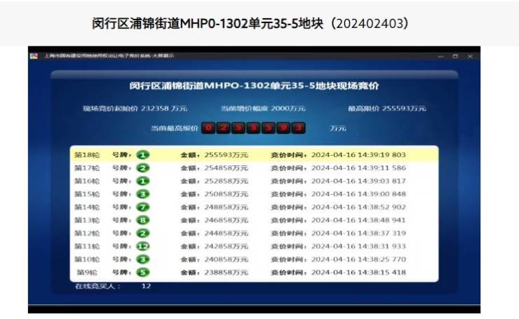 经过18轮报价,地块即达到最高限价255593万元。随后转入竞报“高品质建设”阶段。12号竞买人首开放弃进入后续竞买阶段。