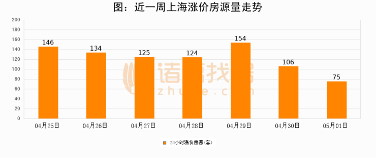 根据诸葛找房数据显示,上海24小时涨价房源量为75套,较04月30日减少31套,环比下降29.2%。与此同时,涨价房源占比小幅回落,对于购房者来说是一个入市窗口期,购房者可抓住时机入市。