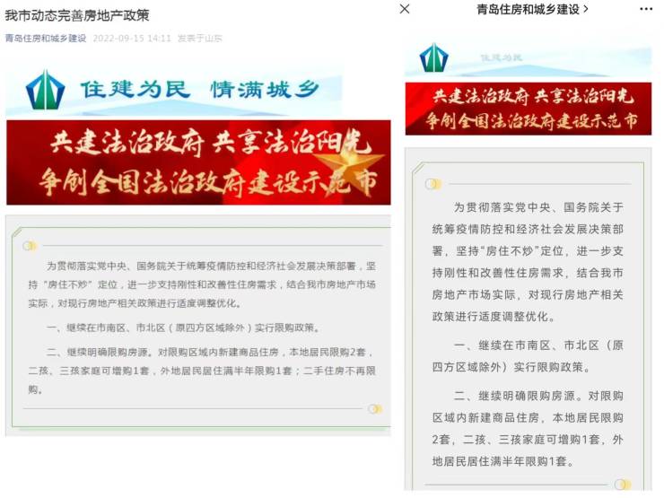 9月15日,青岛住建局官方微信公众平台发布消息称,将在坚持“房住不炒”的定位下,进一步支持刚性和改善性住房需求,结合房地产市场实际,对现行的房地产政策进行适度调整优化。