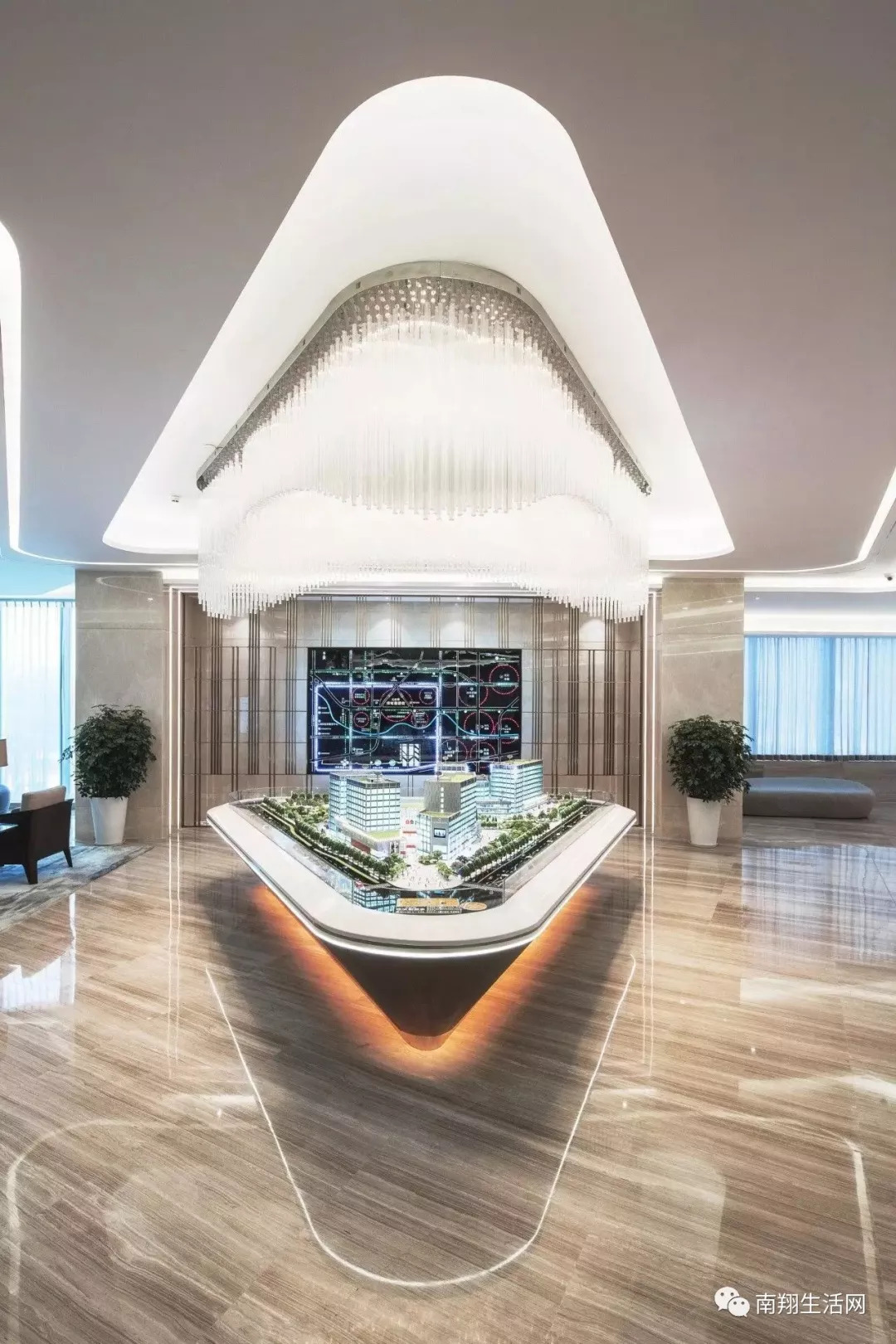 石材拼贴组成的极富肌理感的水景墙,跌水与植栽相互交叠,涌泉的增加使整个空间更为灵动。以白色条石展现了空间的“水韵”肌理,以彰显整个样板区空间风格的时尚与活力。