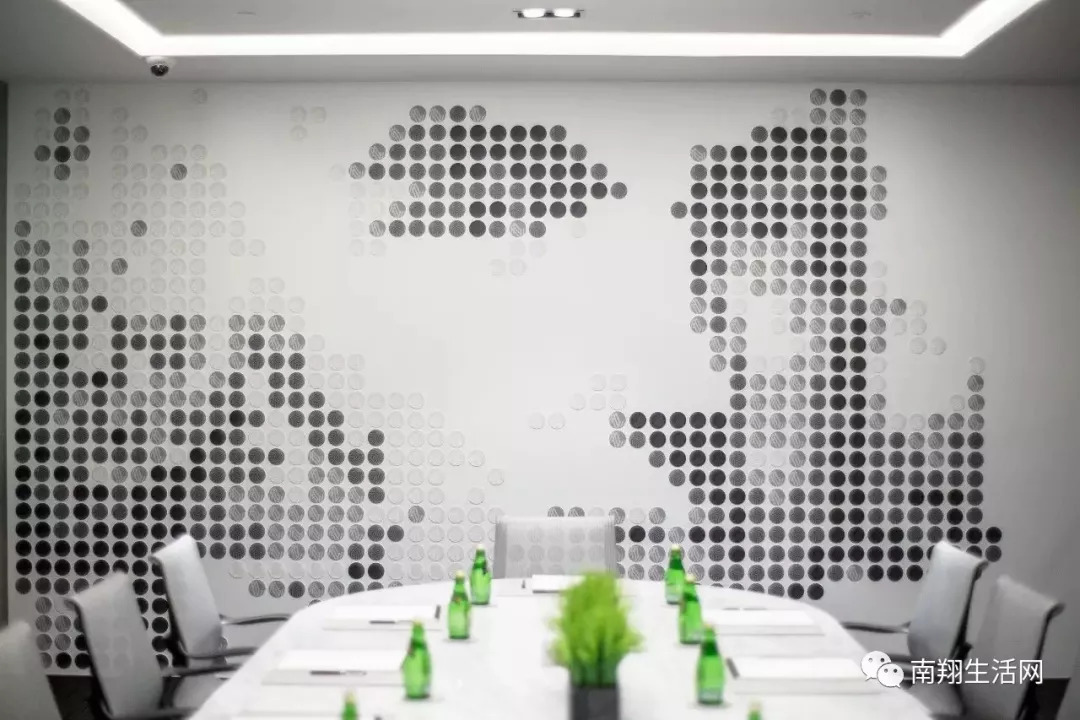 会议室基于当下流行的轻奢主义以“轻奢有度、轻简高效”的设计理念,着力让办公变得更加诗意更有效率,墙面以点及面的平面手法加上不规则分区,为办公区赋予了优雅、富有优质品味的生活态度。