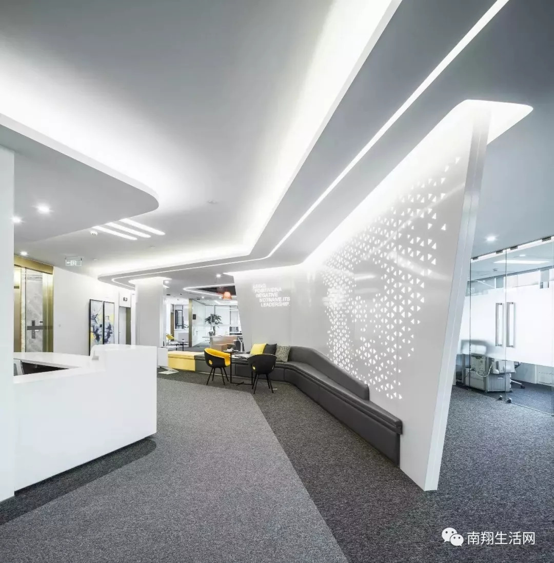 办公大堂着重运用几何图形点线面构成布局,在天地墙各部分几何线条演变成了各种形式的穿插,通过对不同颜色的金属线条材质调控,产生了亦如流水般的律动。