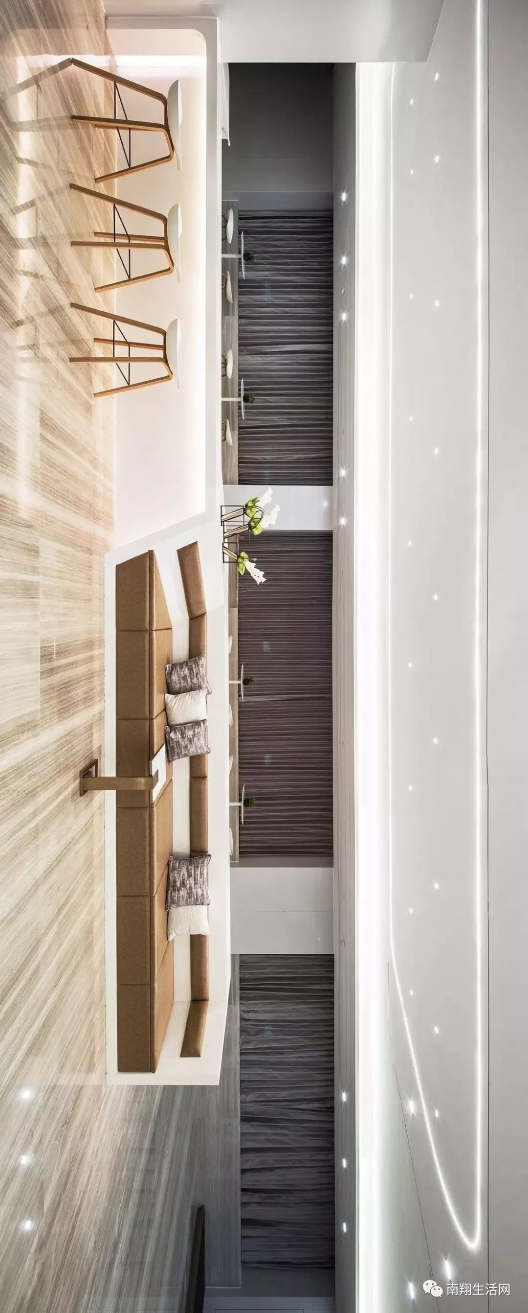 几何不规则形长吧台休闲区,不仅消耗了建筑上的不规则感,也在功能上解决了休息与储物的需求,成功将不利因素变成了一个有利区域。