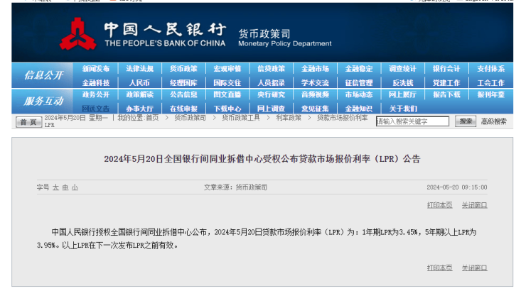 中国人民银行授权全国银行间同业拆借中心公布,2024年5月20日贷款市场报价利率(LPR)为:1年期LPR为3.45%,5年期以上LPR为3.95%,均保持不变。