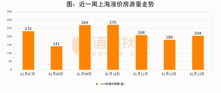 根据诸葛找房数据显示,上海24小时涨价房源量为204套,较01月12日增加24套,环比上涨13.3%。与此同时,涨价房源占比小幅扩大,业主信心有所提升。