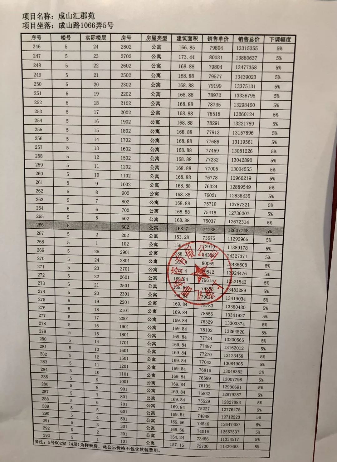 凯利海华府今日公示一房一价表