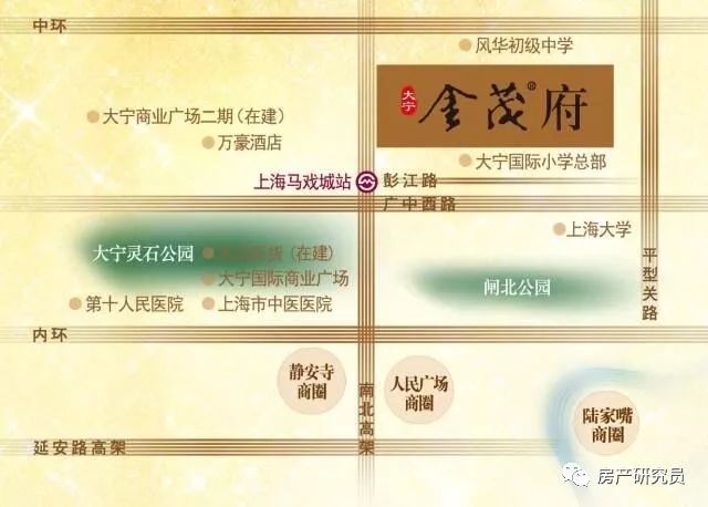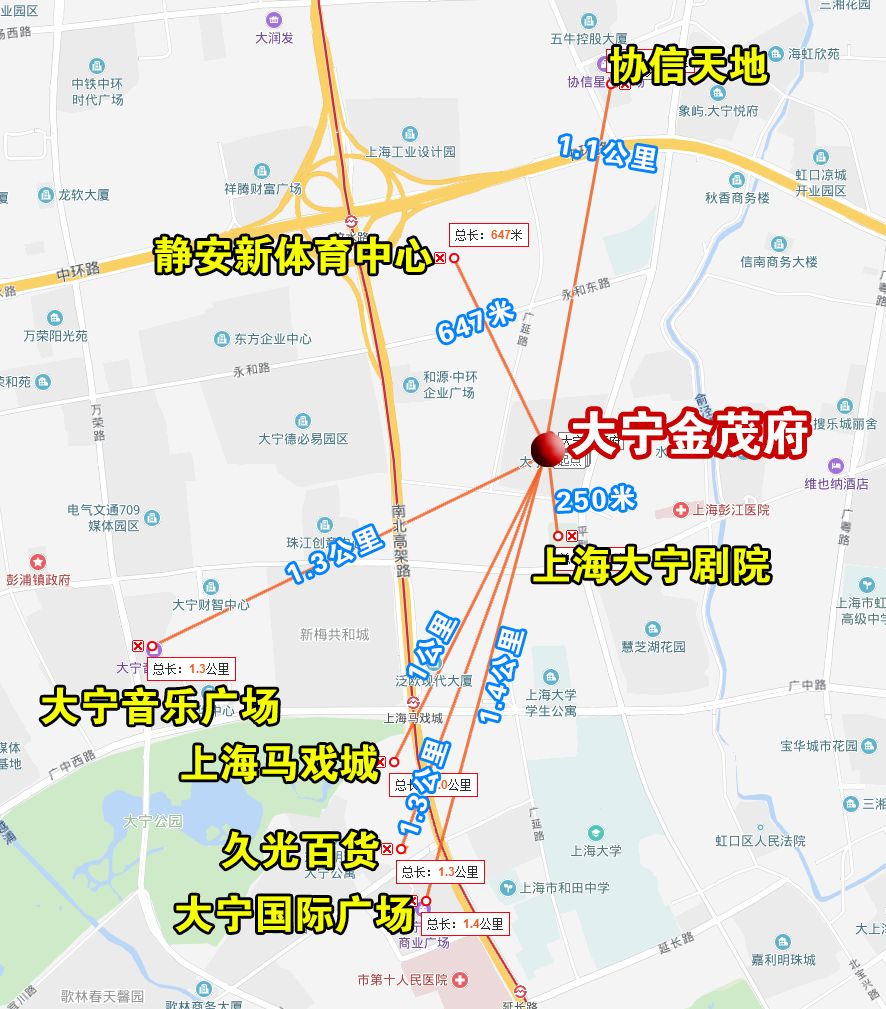 大宁金茂府距离地铁1号线上海马戏城站和汶水路站的直线距离均不超过1公里,自驾可以上汶水路中环高架和南北高架,便捷到达人民广场、新天地、陆家嘴、静安寺等大商圈。