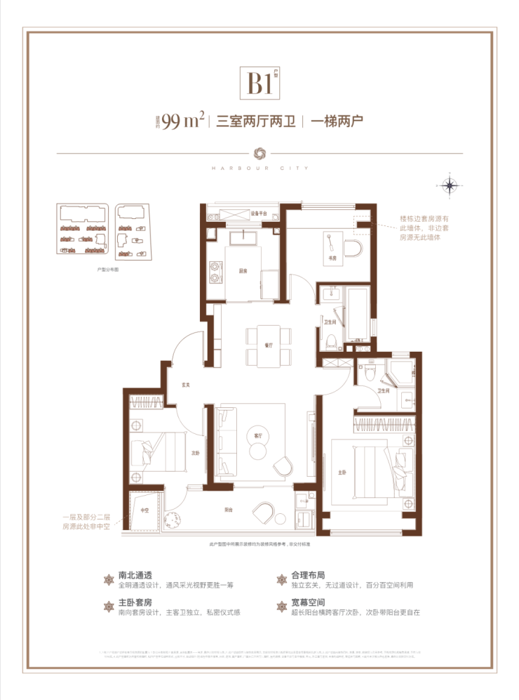 南北通透:项目采用非连廊设计,标准层房源均为1梯2户或2梯2户配置,标准户型均为南北通透,通风、采光、私密性均为绝佳~