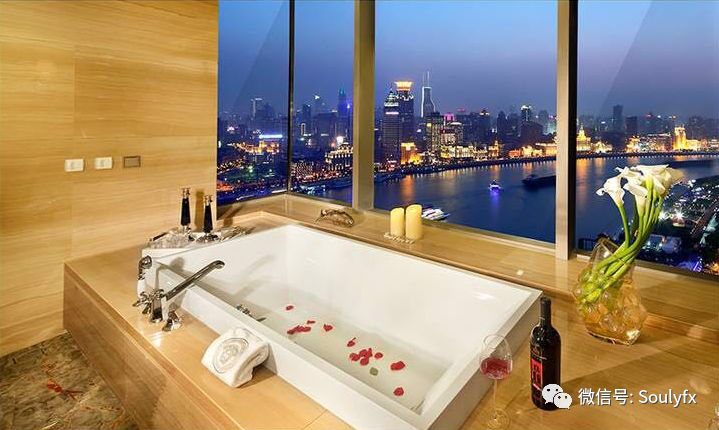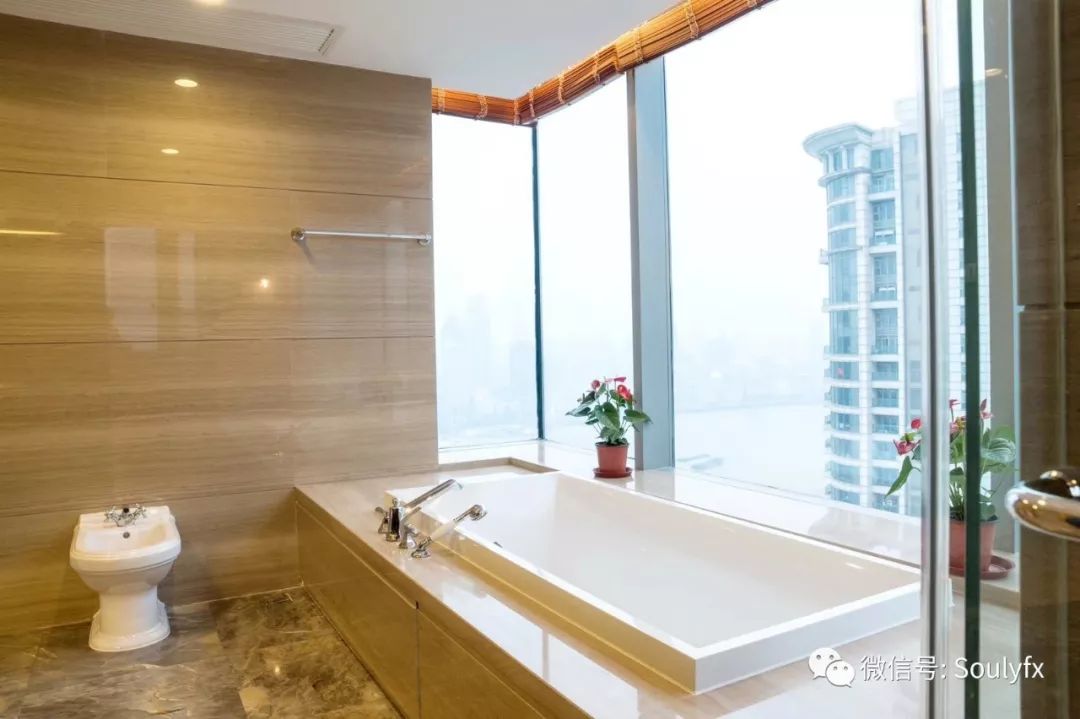 无一例外都有一个超大的景观阳台,正看黄浦江一线江景。这样的房子想不想来一套啊? 先来张主卧卫生间泡澡时的景观吧。