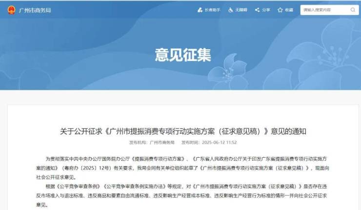 6月12日,广州市商务局发布“关于公开征求《广州市提振消费专项行动实施方案(征求意见稿)》意见的通知”。