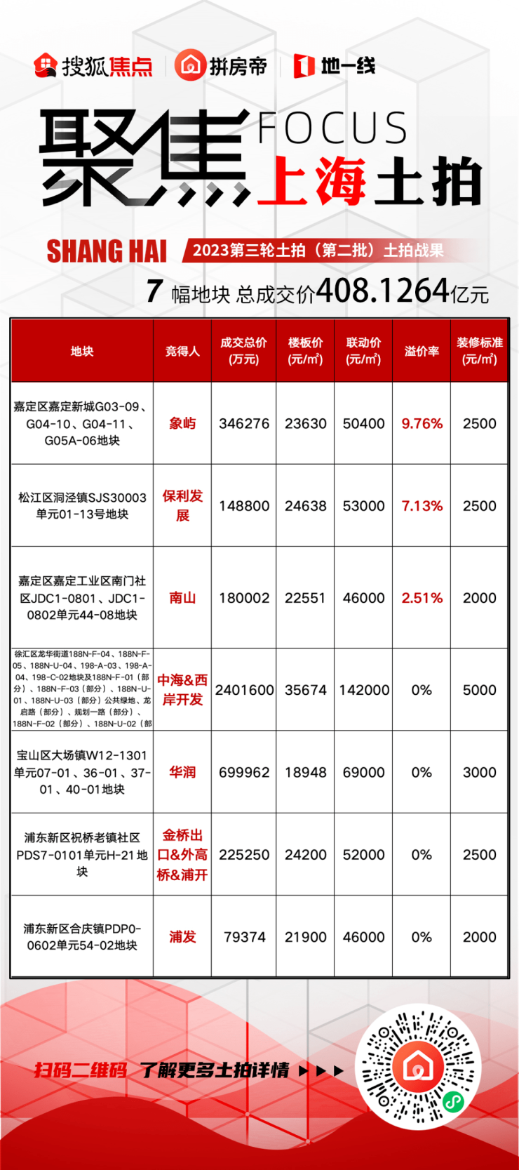 与此同时,华润以底价69.9962亿元拿下宝山区大场镇W12-1301单元07-01、36-01、37-01、40-01地块,成交楼面价18948元/㎡,房地联动价69000元/㎡,装修标准不低于3000元/㎡。