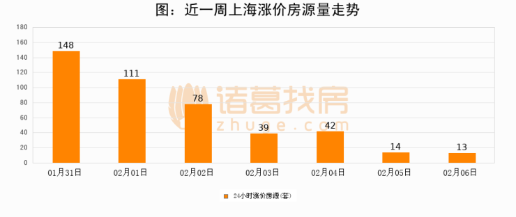 根据诸葛找房数据显示,上海24小时涨价房源量为13套,较02月05日减少1套,环比下降7.1%。与此同时,涨价房源占比小幅回落,对于购房者来说是一个入市窗口期,购房者可抓住时机入市。