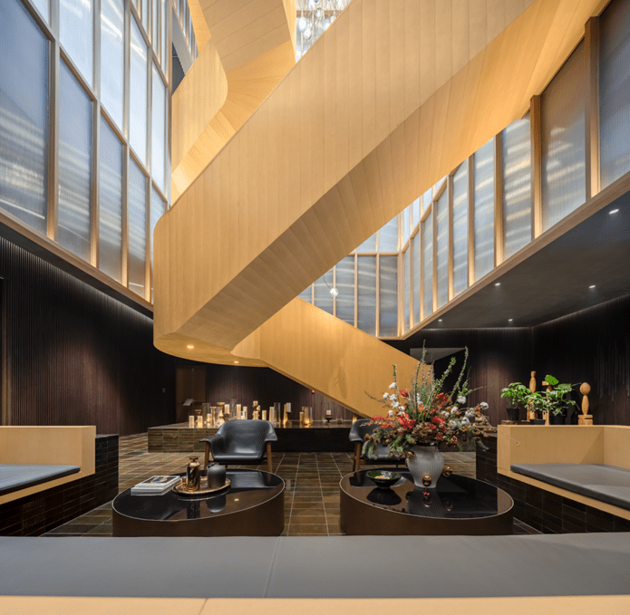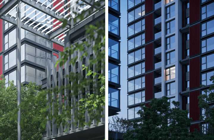 有别于市面上主流的建筑立面,中興路一號以其亮黄鲜红的渐变色外观在区域内辨识度极高。项目采用双线十字塔楼的建筑结构,释放承重墙的转角结构,以获得更自由的室内空间以及270度全景视野,同时也将阳光还给街区。