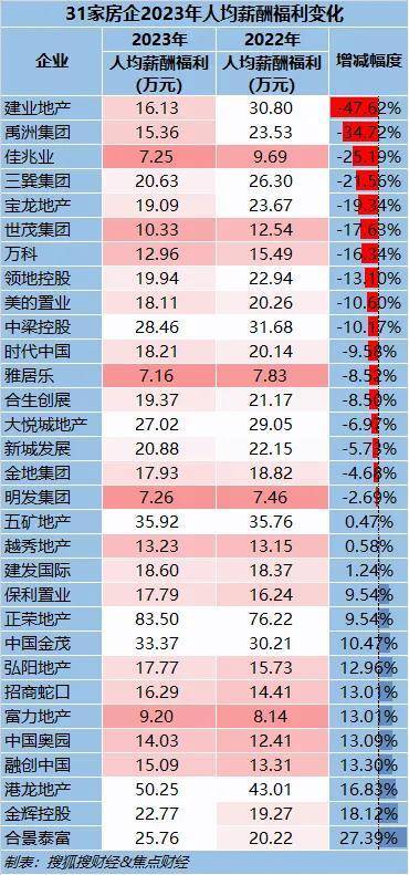 如果从31家房企人均薪酬福利增减看,2023年上涨的房企并不少,有14家房企去年出现上涨。其中,合景泰富涨幅最高,去年涨27.39%;金茂、弘阳地产、招商蛇口、富力地产、奥园、融创、港龙地产和金辉控股涨幅超10%,这些企业虽然员工减少,但人均薪酬却出现上涨。