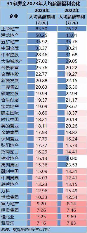 从人均薪酬福利看,正荣地产依旧高居榜首,2023年人均薪酬福利83.5万元;其次是港龙地产,人均薪酬福利50.25万元,五矿地产为35.92万元,金茂33.37万元,中梁控股28.46万元,大悦产地产27万元。