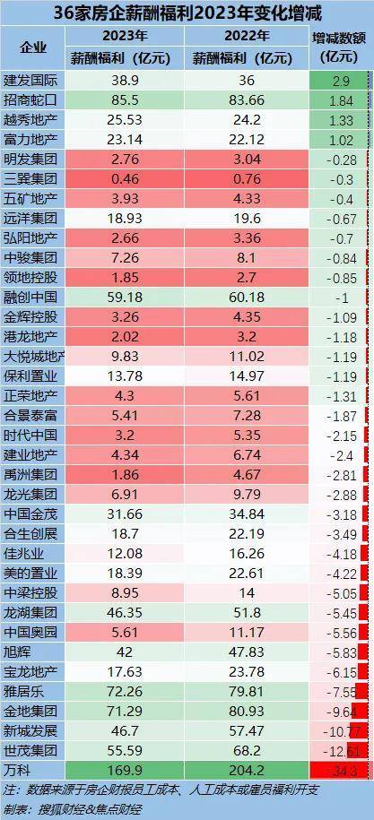 在搜狐财经统计的36家房企中,薪酬福利或员工成本总开支上涨的企业,仅有建发国际、招商蛇口、越秀地产和富力地产4家企业,其余32家房企均呈不同程度的下滑态势,其中万科去年减少34.3亿元,新城发展与世茂集团均减超10亿元。