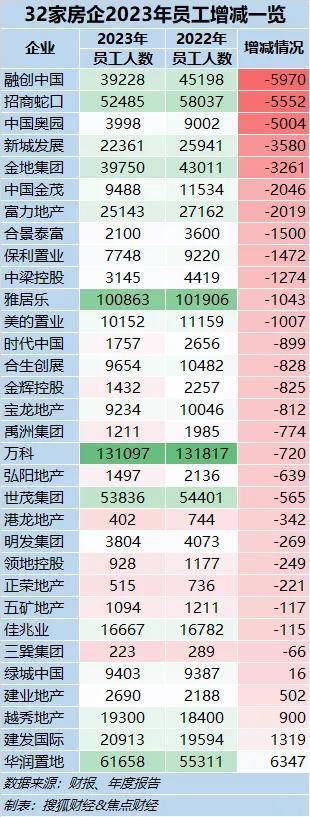根据搜狐财经统计,纳入统计的32家典型房企中,2023年除绿城中国、建业地产、越秀地产、建发国际和华润置地5家企业之外,其余27家房企均呈减员态势。