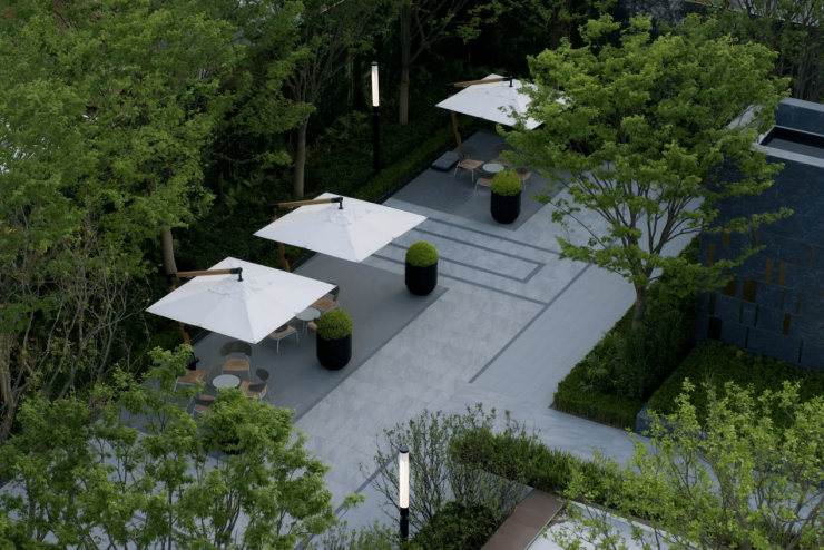 循境林荫,喷薄的绿色携静谧,倾泻于编织状的格栅之上;游走于艺术展厅,阳光透过斑驳树影,映照繁花,写下时光的诗;大片的原木,搭配舒适的绿,还原自然真意的同时,也为都市敬呈了一方归心的谧境。