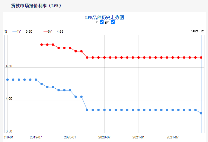 中国人民银行授权全国银行间同业拆借中心公布,2021年12月20日贷款市场报价利率(LPR)为:1年期LPR为3.8%,下调5个基点,5年期以上LPR为4.65% ,与上个月持平。