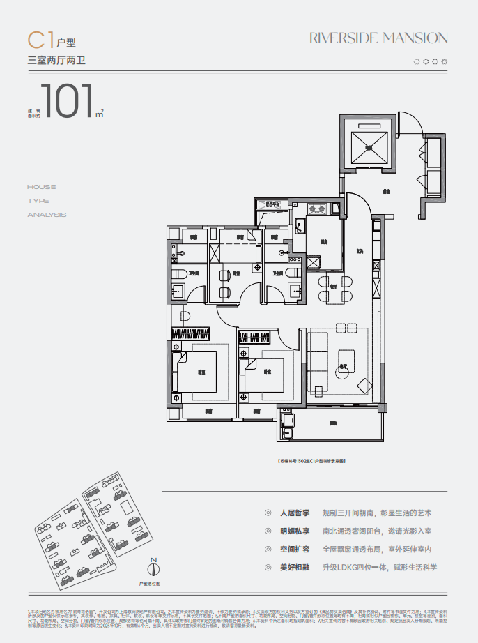 艺术的空间作为献予所有理想主义者的作品,花语前湾C1户型以格局和功能讲述生活的意境。建筑面积约101㎡的3室2厅2卫格局,南北通透、动静分区,“LDKG”的空间理念诞生——将客(Livingroom)、 餐 (Diningroom)、 厨(Kitchen)、阳台(Garden balcony)四大公区融为一体,实现通透居宅的美好样板。