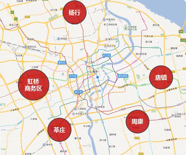 以人民广场-陆家嘴为城市中心,15公里为半径,5大外环豪宅区隐隐浮现。我们看一下这个5个板块的现状。