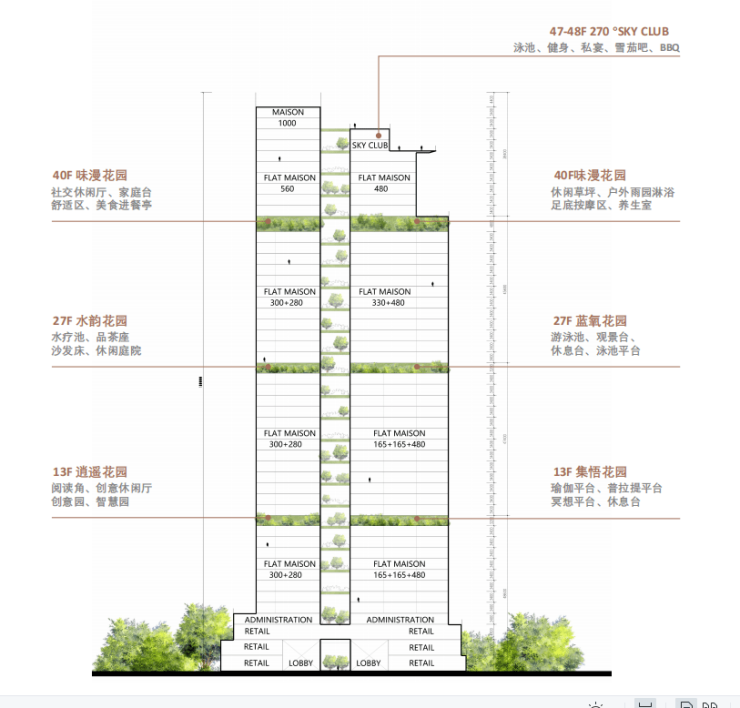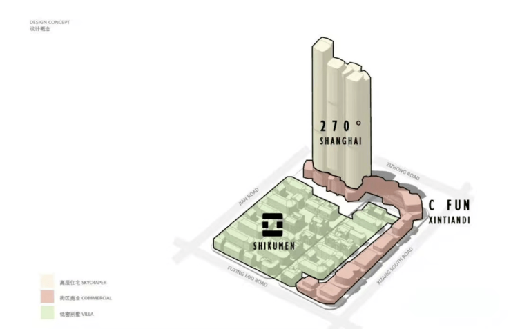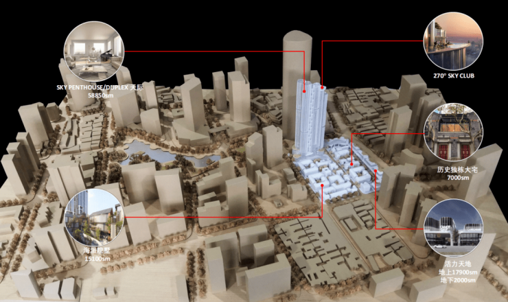 可以看到,产品有180米超高层、海派别墅、活力天地、历史独栋大宅以及270°SKY CLUB组成。