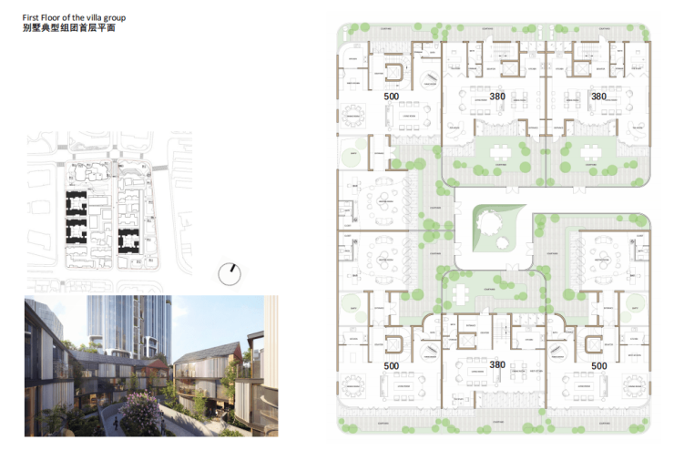 按照方案,别墅面积段大概在380-500㎡,组合形式不同于市面上常见的联排、双拼。而是一种围绕中心/社交景观,呈围合式布局的创新方式。
