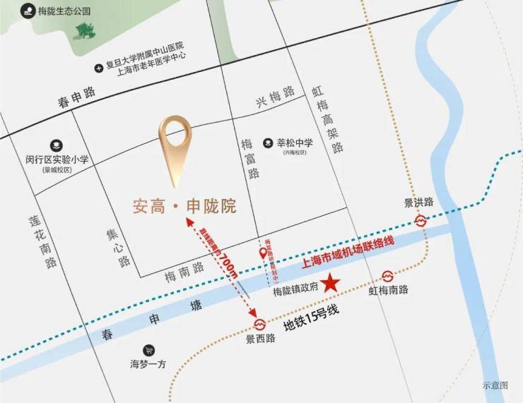 安高·申陇院全城高能级资源内外通达,沪闵高架路、虹梅高架路、银都路等主城核芯干道,纵横连接全城活力节点同频上海发展,生生不息。
