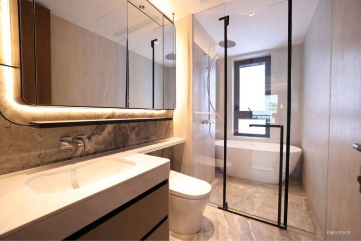 同时,心院170也在浴室花费了诸多心思:在淋浴间贴心安置凹龛,并通过市场研究计算,将凹龛高度控制到32cm+,让物品的摆放更加合理,居者使用更加便捷。浴室镜箱内藏有乾坤,小小的空间可装下吹风机、剃须刀、消毒机等各类日用电器,并为女主人惊喜设计了一个当红时尚单品——恒温美妆冰箱,“心爱的她”再也不用担心化妆品的安危了。