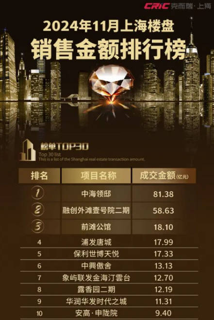 2025开年爆点,非“哪吒”莫属!从大年初一上映以来,《哪吒2》一路高歌猛进,票房突破百亿,登顶全球影史单一市场票房第一!强大的票房号召力背后,是市场对所有匠心之作的高度认可。销售金额/销售面积/销售套数三项指标均荣登11月上海楼盘排行榜TOP10。(数据来源:克而瑞新房销售榜单)