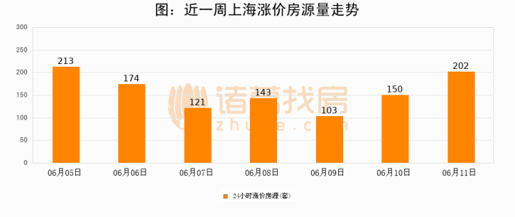 根据诸葛找房数据显示,上海24小时涨价房源量为202套,较06月10日增加52套,环比上涨34.7%。与此同时,涨价房源占比小幅扩大,业主信心有所提升。