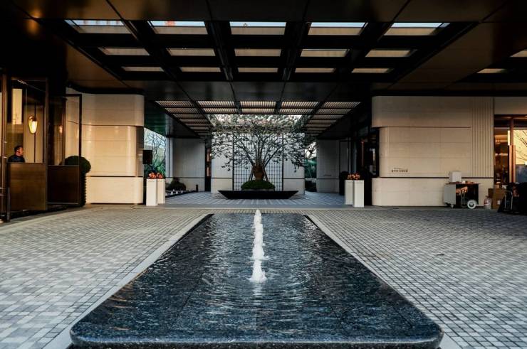 中庭水景与大树聚场形成美妙的呼应,宛如镶嵌于示范区的深蓝之钻。约10米长的蓝钻大理石,传统手工匠人打磨每一条边线与切割面,用最笨拙的匠艺呈现出现代工业无法超越的审美性,清澈水面映照璀璨蓝光,呈现一种静谧而又美观的艺术生活场景。