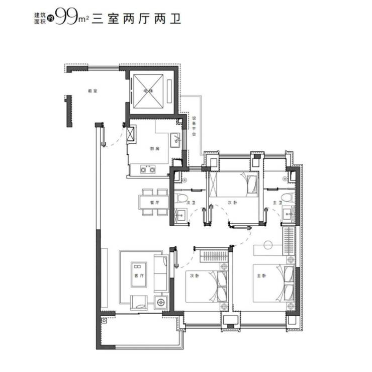 先看主力建面约99㎡户型,功能性做到3房2厅2卫,适配市场主流需求,三开间朝南布局,动静分离。三个卧室都有飘窗,主卧套房设计,带有独立卫生间,提升了主人的居住舒适度及私密性。
