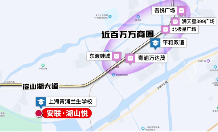 商业上,17号线淀山湖大道站附近集结了万达茂、东渡蛙城、吾悦广场、满天星399等综合体,近百万方商业一路连缀。项目和商业之间,由一条开车通畅的淀山湖大道串联,几脚油门,就能享受繁华。