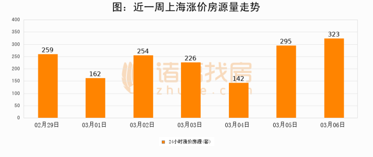 根据诸葛找房数据显示,上海24小时涨价房源量为323套,较03月05日增加28套,环比上涨9.5%。与此同时,涨价房源占比小幅扩大,业主信心有所提升。