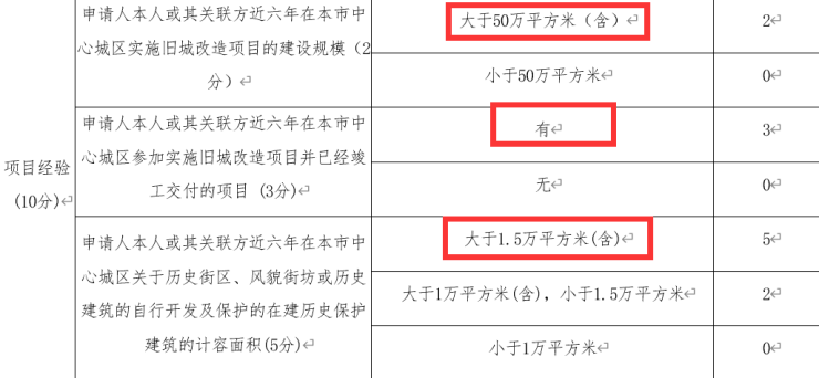 1)近六年在本市中心城区实施旧城改造项目的建设规模,最高要求大于50万平方米,以10万平方米一个项目算,参与该项目的房企至少需要在市中心参与过5个旧城改造项目经验;