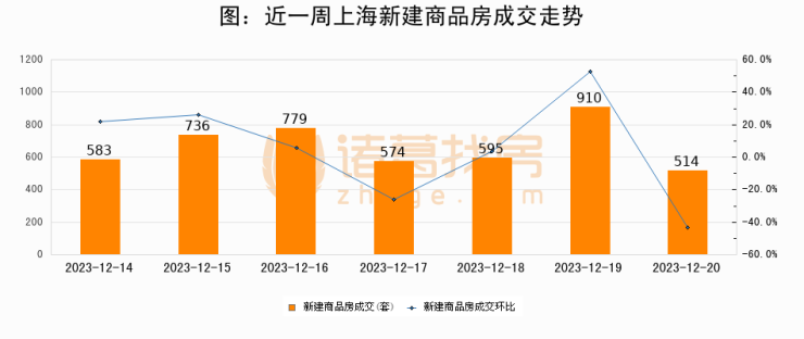 根据上海市房地产交易中心数据显示,2023年12月20日上海新建商品房成交514套,较昨日减少396套,环比下降43.5%