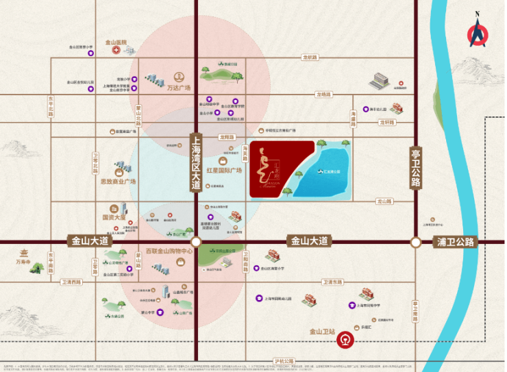 汇龙府项目东面的地块就是金山区政府与华东师范大学合作共建的九年一贯制公办学校----华师大二附中金山实验学校,目前双方已经签约准备建设。项目周边另有金山小学、海棠小学、金山初级中学、上师大二附中、金山世界外国语学校等名校资源环伺,约1公里内可达万达、百联、思致商圈,依托沈海、新卫、沪金三大高速路网,金山大道、湾区大道、亭卫公路三大城市干道,迅捷链接全城,全方位配套满足业主日常所需。