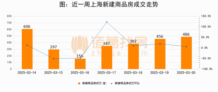 根据上海市房地产交易中心数据显示,2025年03月20日上海新建商品房成交486套,较昨日增加30套,环比上涨6.6%