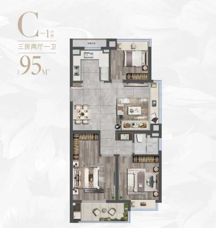 三开间朝南+客餐厅阳台一体化设计,尺度阔绰,视野开阔,采光效果极佳;