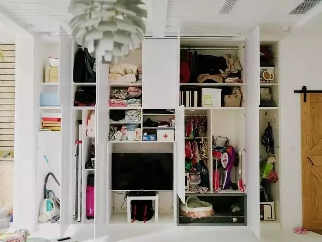 但是因为家里人多自然东西也多,所以我在客厅这里设计了一整面墙的储物柜,满足了平时大量的储物需求,很多日常换洗的衣服和包包,连电视机也被我顺手给藏起来了。