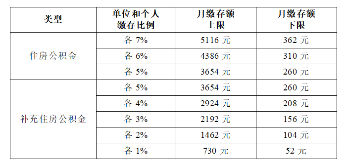 自2023年7月1日起,本市职工住房公积金的缴存基数由2021年月平均工资调整为2022年月平均工资。2023年度职工本人和单位住房公积金缴存比例为各5%至7%,由单位自主确定;单位可以自愿参加补充住房公积金制度,补充住房公积金缴存比例为各1%至5%。2023年度本市住房公积金月缴存额上下限如下: