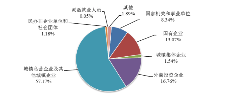 缴存职工中,国家机关和事业单位占8.34%,国有企业占13.07%,城镇集体企业占1.54%,外商投资企业占16.76%,城镇私营企业及其他城镇企业占57.17%,民办非企业单位和社会团体占1.18%,灵活就业人员占0.05%,其他占1.89%;中、低收入占92.40%,高收入占7.60%。