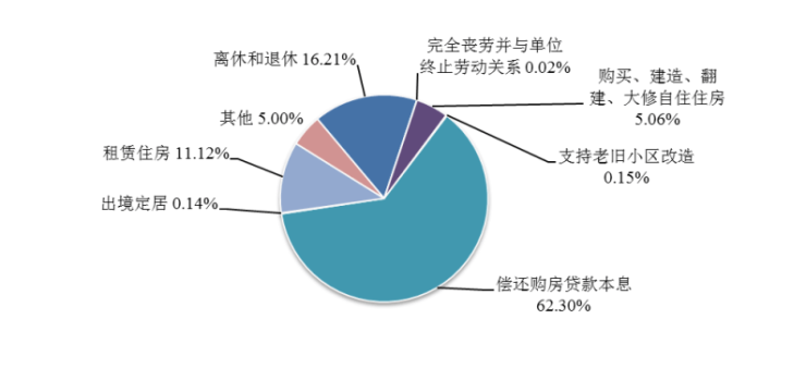 提取金额中,偿还购房贷款本息占62.30%,租赁住房占11.12%,购买、建造、翻建、大修自住住房占5.06%,支持老旧小区改造占0.15%,离休和退休提取占16.21%,完全丧失劳动能力并与单位终止劳动关系提取占0.02%,出境定居占0.14%,其他占5.00%。