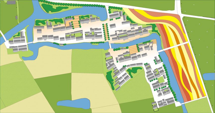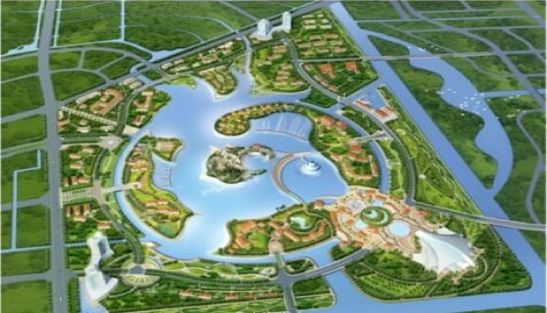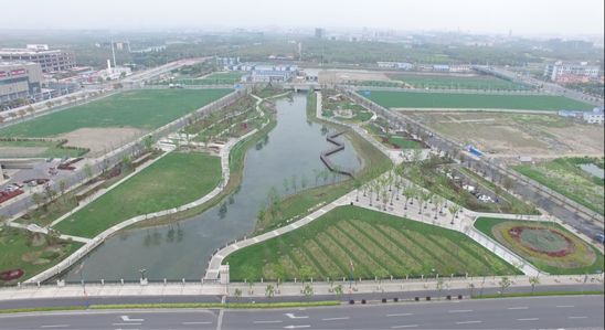 龙耀路以北景观设计主要以树林、草坪、广场、花园相结合,使“水系和绿地穿插,汽车、自行车、人与河流并行不悖”。
