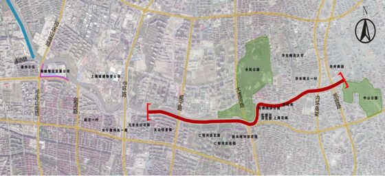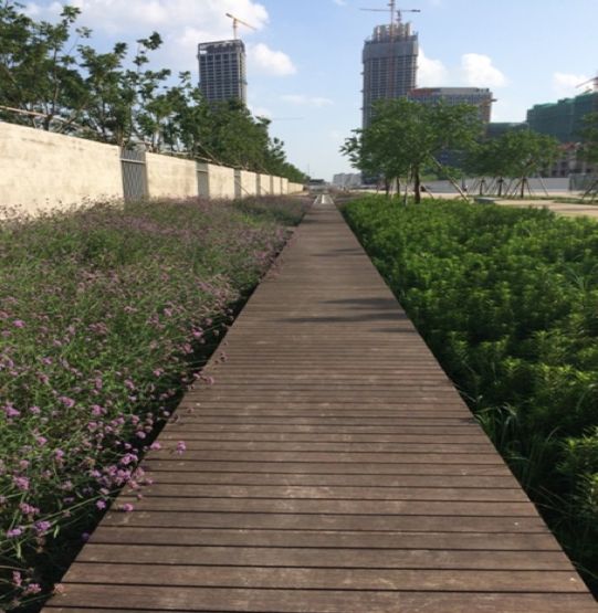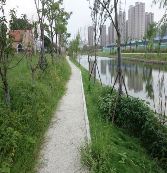 苏州河慢行步道(一期)东起中山公园3号门,西至双流路,全长约3.7km。通过对防汛通道、沿河人行步道、沿河公园绿地等滨水岸线景观等进行改造提升。建设雨水花园,蓄渗、净化径流雨水;对人行步道和局部广场进行透水铺装建设,对驳岸绿化带进行植草沟+雨水湿地的改造,使雨水得到进一步的沉淀、过滤、净化和调蓄。