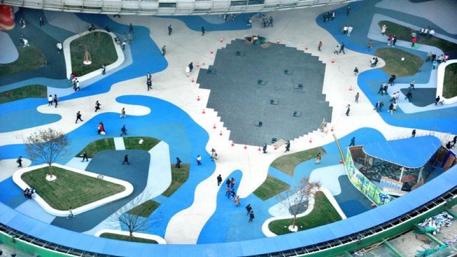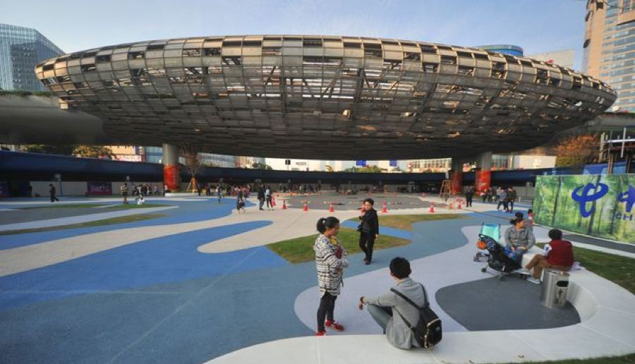 五角场下沉式广场,位于上海东北部四平路、黄兴路、翔殷路、淞沪路、邯郸路等五条城市主干道的交汇处,是五角场各商圈的交通纽带。