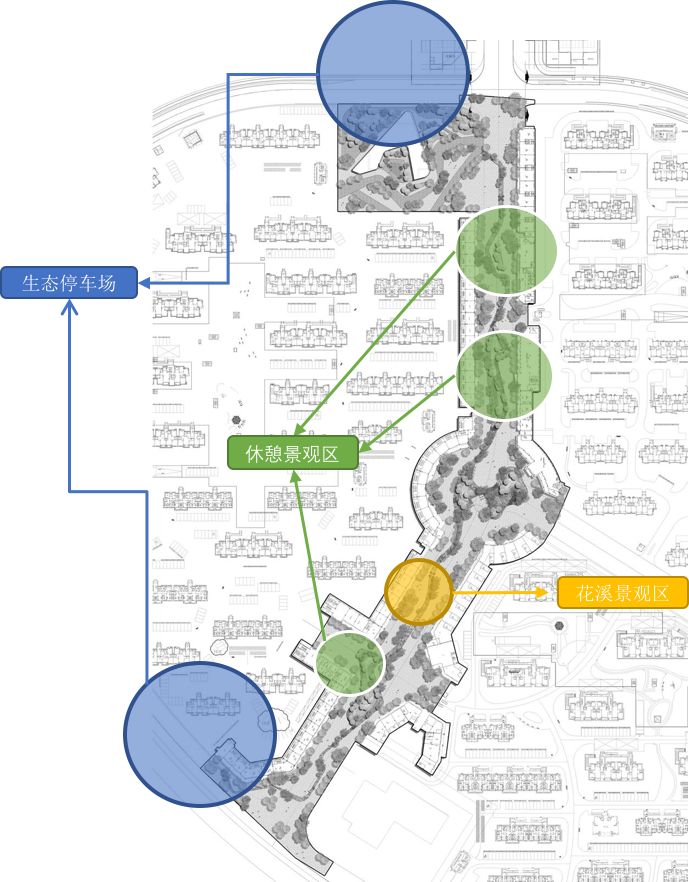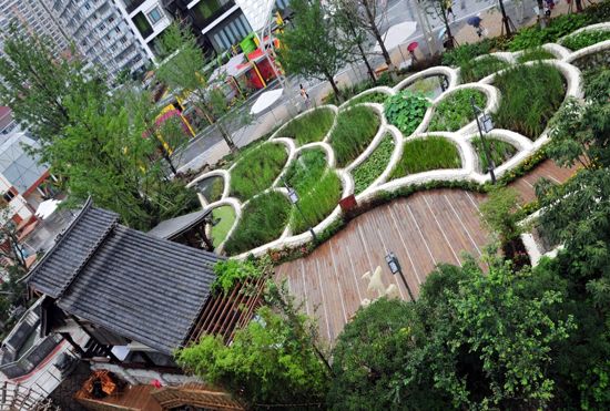 除了利用陶土砖的透水性铺装园路,还建造一条旱溪,配合植物营造溪水景观,达到晴天景观,雨天存水,旱溪可与雨水管渠联合应用。
