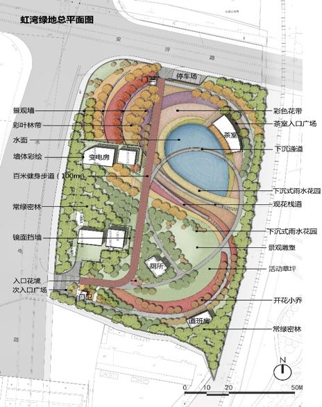 虹湾绿地以绿化种植为主体,实现生态防护、休闲游憩、雨水收集、科普示范、公共服务、景观观赏等多功能的复合统一,体现现代节约型绿地的特征。
