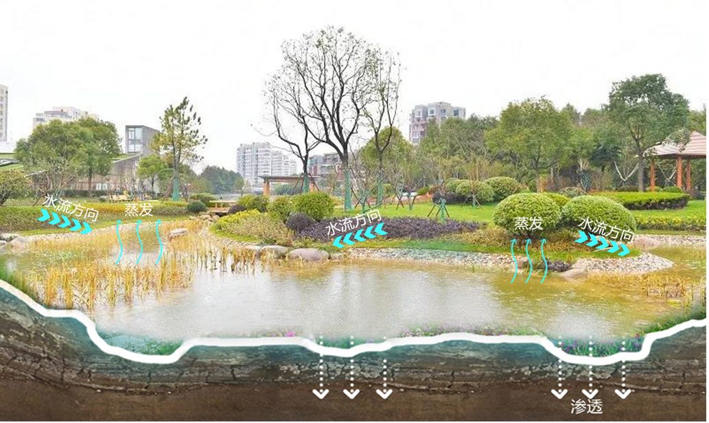 同时,在水池一边就势设置下沉式雨水花园,种植水生、湿生植物,承载周边汇水区雨水,就地自然蓄渗,充分发挥其对雨水的净化、滞留作用。